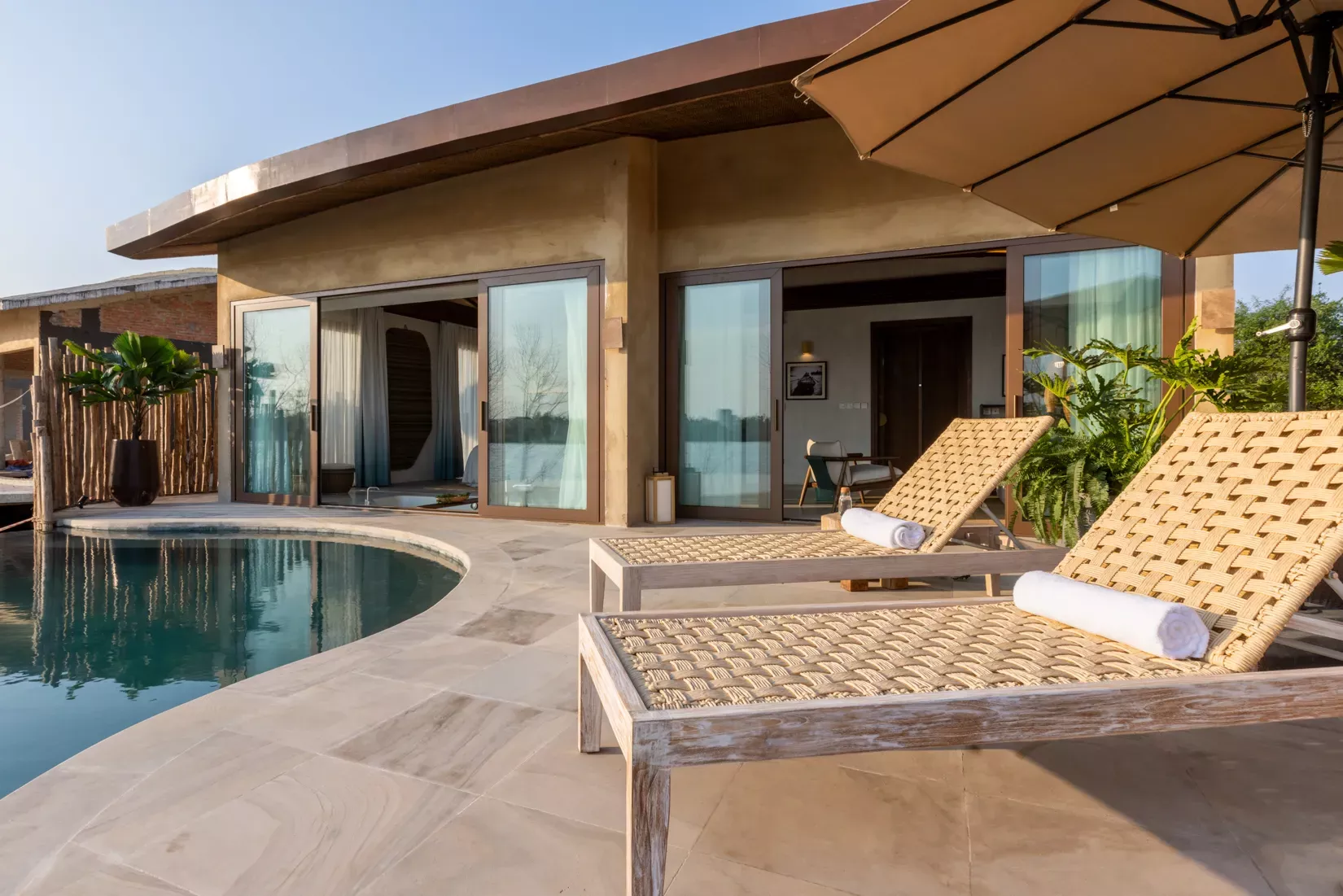 RIVER POOL Villa Eine private Poolvilla mit einem Schlafzimmer mit direktem Flussblick. Offenes Schlafzimmer mit versunkener Badewanne und Poolblick, ein eigenes Bad, eine Lounge mit Außenterrasse mit Liegestühlen, auf einer Gesamtfläche von 148 qm.